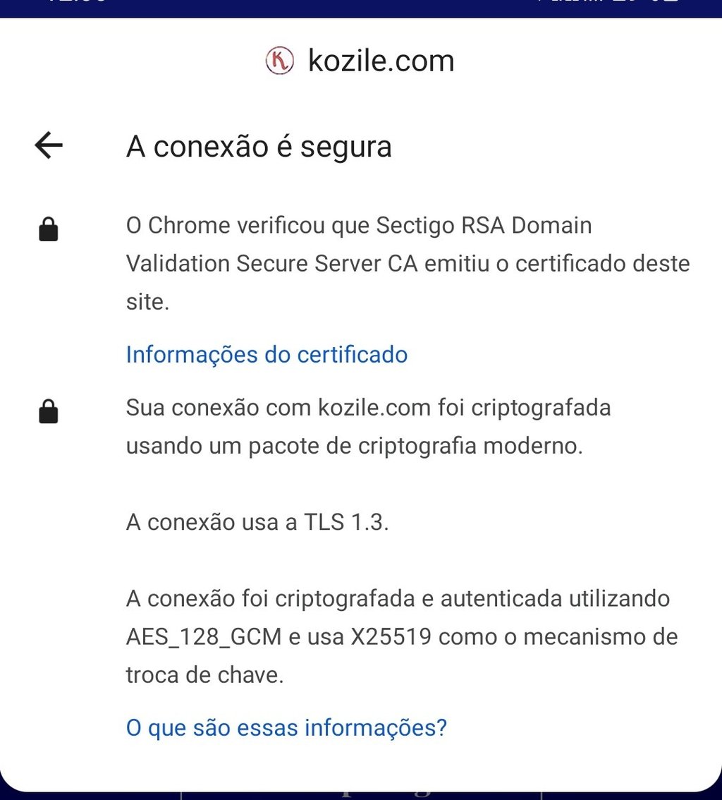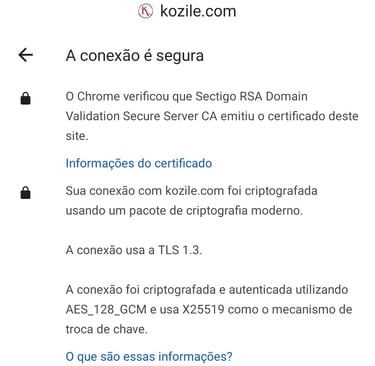 O site kozile ("kozile.com") é 100% seguro e possui Certificado de Segurança SSL de 256 bits e o mais moderno TLS podendo ser verificado essa informação no 'cadeado' dos navegadores. O SSL (Segure Sockets Layer) e o TLS (Transport Layer Security) são um tipo de segurança digital que adiciona uma criptografia entre site (servidor) e visitante (cliente) que assegura os usuários que suas informações como senhas e números de cartão de crédito enviadas ao site serão mantidas em segurança.